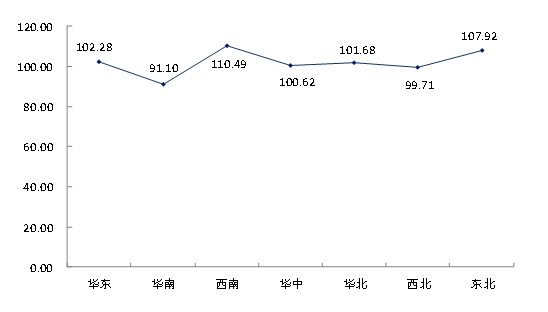 与基期相比,华南地区和西北地区的区域价格指数分别下降了8.9点和0.29点外,其余区域表现为上涨态势。其中涨幅较大的是西南、东北地区,区域价格指数分别上涨了10.49点、7.92点。具体数据见表3。